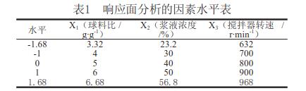 影響球磨機(jī)超微粉碎效果的主要因素有球料比、攪拌器轉(zhuǎn)速、枸杞子渣漿液濃度和粉碎介質(zhì)。因此本研究以上述3個因素作為試驗因素,固定球磨介質(zhì)為Φ10mm氧化鋯球,在單因素試驗的基礎(chǔ)上,通過響應(yīng)面分析化佳工藝參數(shù),以粉碎后的顆粒粒度d50作為超微粉碎評價效果。
