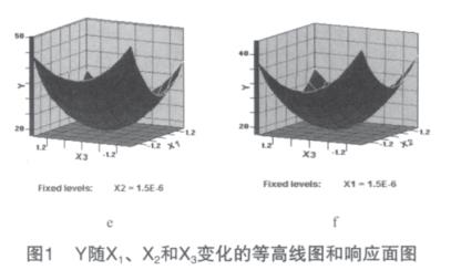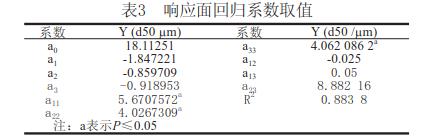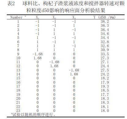 利用響應(yīng)面分析法[1]化枸杞子渣超微粉碎工藝參數(shù)。在單因素預(yù)試驗基礎(chǔ)上,用SAS軟件系統(tǒng)進(jìn)行響應(yīng)面分析,設(shè)計一個三因素五水平的回歸方程來擬合因素和指標(biāo)(響應(yīng)值)之間的函數(shù)關(guān)系。選擇球料比(X1)、枸杞子渣漿液濃度(X2)和攪拌器轉(zhuǎn)速(X3)作為因素,以粉碎后的顆粒粒度d50作為響應(yīng)值對球磨機(jī)濕法超微粉碎工藝進(jìn)行化。